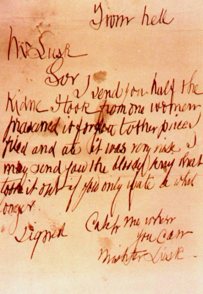 Я посылаю Вам половину почки, которую я взял у одной из женщин и сохранил для вас. Вторую половину я зажарил и съел, она была прелестной на вкус. Я пошлю Вам окровавленный нож, которым вырезал её, если Вы подождёте дольше.